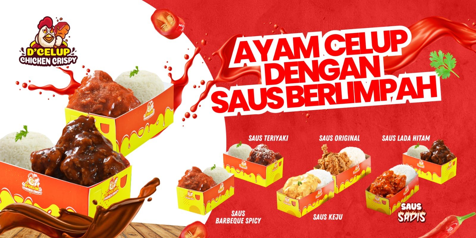 Tak ketinggalan, ada juga Ayam Crispy Saus Sachet,  pilihan praktis dengan rasa tetap istimewa!. Promo Spesial GRAND OPENING!. Beli Dua Ayam Celup Saus Melimpah, langsung dapat GRATIS 1 Teh Poci Segar!. Cocok buat teman makan santai bareng keluarga, teman, atau pasangan. Promo berlaku selama masa Grand Opening!.